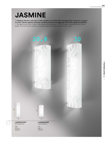 / The Jasmine wall lamp, made of satin glass and enhanced by LED technology, is decorated with chrome